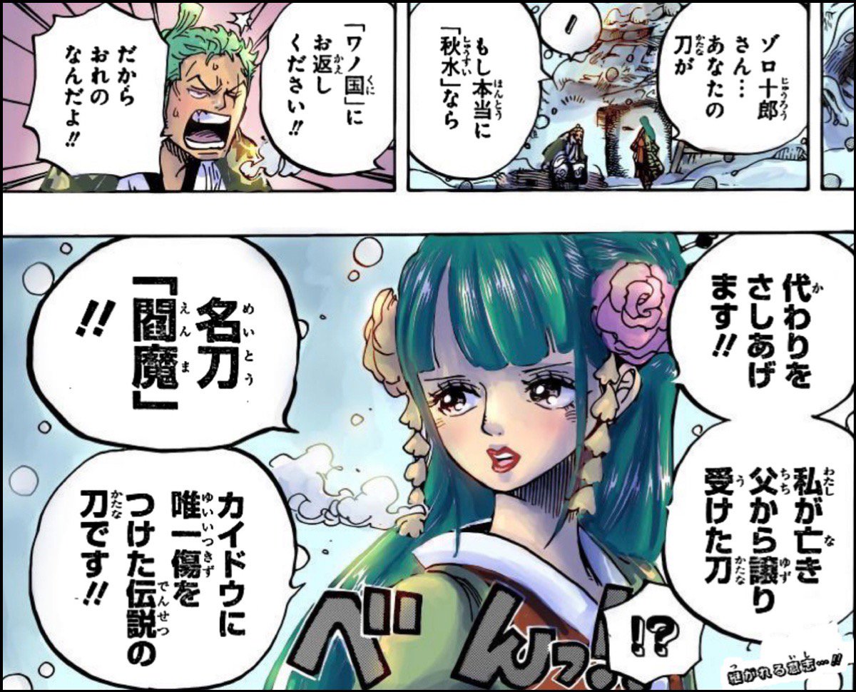 Log ワンピース考察 على تويتر ワノ国の国宝 秋水 の代わりに おでんの名刀 閻魔 を譲る とゾロ に告げる日和 それは カイドウに傷をつけた伝説の刀だそう この閻魔について気になる事を考えてみた なぜ日和が譲り受けた 現在はどこにある